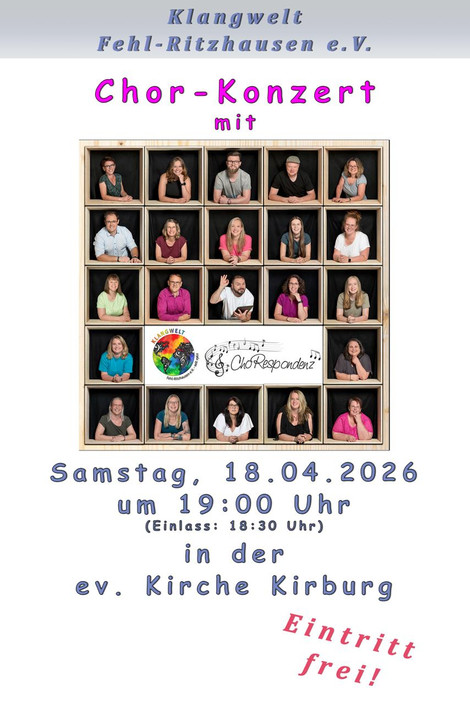 Die ev. Kirche Kirburg wird am Samstag, 18.04.2026, in stimmungsvolles Licht getaucht, wenn ChoRespondenz der Klangwelt Fehl-Ritzhausen e.V. zu einem besonderen Konzertabend einlädt.